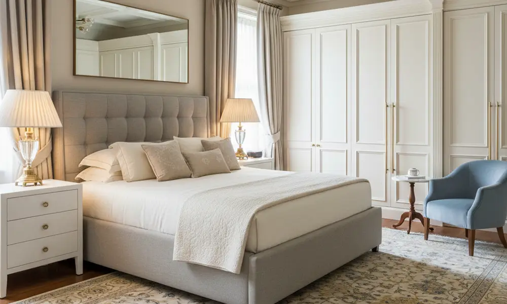 - Em dormitórios de casal, tons neutros, texturas suaves e padrões discretos reforçam a sensação de aconchego e ajudam a criar um ambiente mais propício ao descanso, sem interferir na leitura do mobiliário.